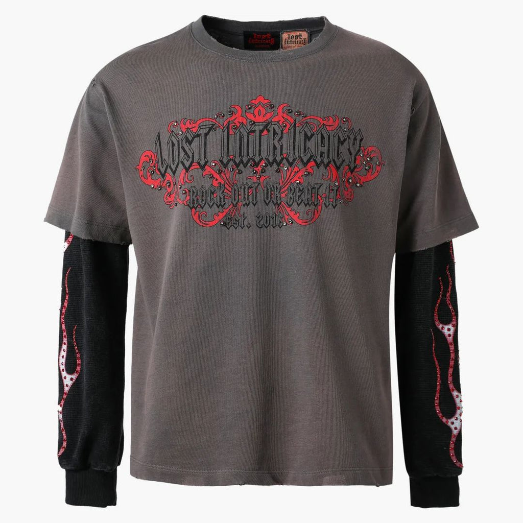 Das Shirt hat eine graue, leicht ausgewaschene Kurzarm-Optik, unter der schwarze, strukturierte Langarmärmel hervorschauen. Auf der Brust steht in auffälliger Gothic-Schrift „Lost in Care – Forged for Greatness, est. 2016“ (teilweise schwer lesbar durch das verschnörkelte Design). Die Schrift ist in Schwarz mit roten, ornamentalen Verzierungen gestaltet, die dem Motiv einen rockigen, leicht barocken Look verleihen. Die schwarzen Ärmel sind mit roten Flammen-Elementen verziert, was dem Shirt einen edgy, biker-inspirierten Charakter gibt.Auf dem oberen Rücken befindet sich ein kleineres Motiv mit dem Schriftzug „Lost in Care“. Darüber ist eine rote Figur (wirkt wie eine stilisierte Person oder Heiligenfigur) innerhalb eines kreuzartigen Rahmens abgebildet. Um das Motiv herum sind kleine Nieten-Details angedeutet, die den rebellischen Stil unterstreichen. Insgesamt vermittelt das Shirt einen düsteren, rockigen Streetwear-Vibe mit Gothic- und Biker-Ästhetik.Bei HYPENEEDZ erhältst du ausschließlich neue und 100% originale Produkte.