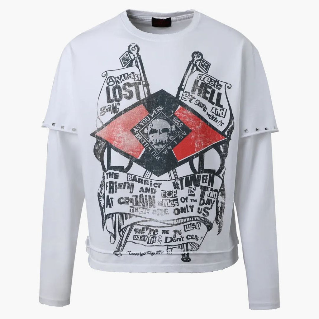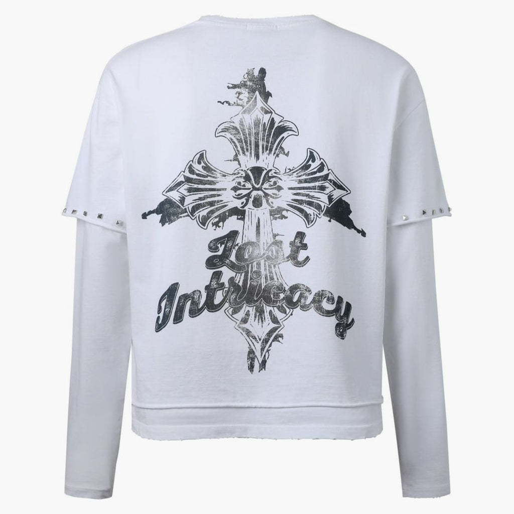 Weißes Longsleeve im auffälligen Layered-Design mit integrierten Doppelärmeln und dekorativen Nieten-Details an den kurzen Ärmeln. Die Vorderseite zeigt einen markanten „Lost Gang“ Print im Vintage-Style mit Totenkopf-Element, Bannern und typografischen Statements im Used-Look in Schwarz und Rot. Auf der Rückseite setzt ein großes Kreuzmotiv mit „Lost Intricacy“ Schriftzug ein starkes Gothic-Statement. Hochwertige Baumwollqualität mit lässiger Passform – ideal für edgy Streetwear- und Rock-inspirierte Looks.Bei HYPENEEDZ erhältst du ausschließlich neue und 100% originale Produkte.