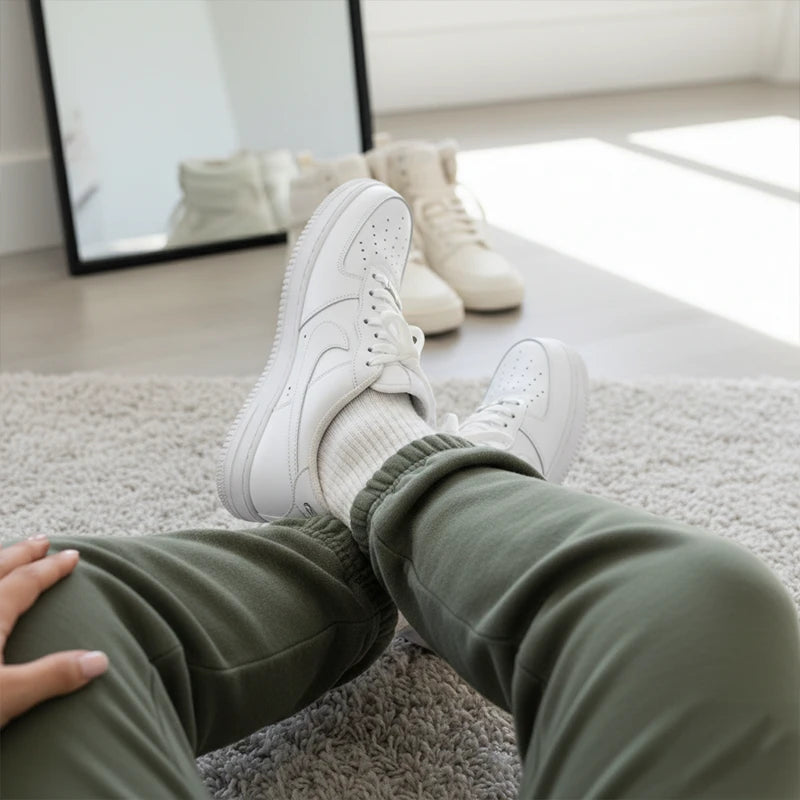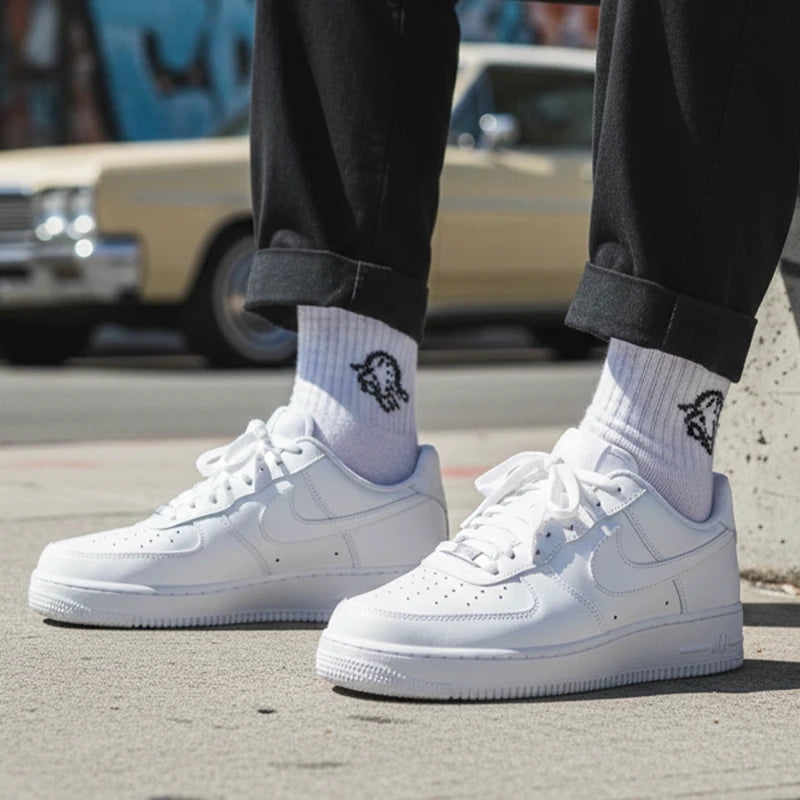 The Nike Air Force 1 Low '07 in classic white is a real icon among the sneakers. Its elegant leather design with the brand-typical Swoosh-overlays gives every outfit an unmistakable look. The carefully designed, perforated toe cap not only ensures breathability, but also underlines the timeless design. A subtle Nike logo can be found on the heel, while the hard-wearing white sole offers the best comfort. Since its introduction in 2007, this style has established itself as an indispensable classic that has repeatedly found its way back to the shelves. Perfect for everyone who value style and quality.Bei HYPENEEDZ erhältst du ausschließlich neue und 100% originale Produkte.