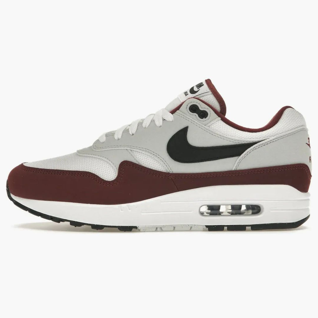 With the Nike Air Max 1 Dark Team Red you lift your sneaker style to a new level. These timeless shoes combine comfort and aesthetic stimulus in an impressive way. The dynamic play of colors made of white, platinum, black and burgundy red is supplemented by a sophisticated material combination of suede and textile. The deep red details of Mudguards, inner lining and branded logos provide visual accents, while the iconic black Swoosh logo rounds off the look perfectly.