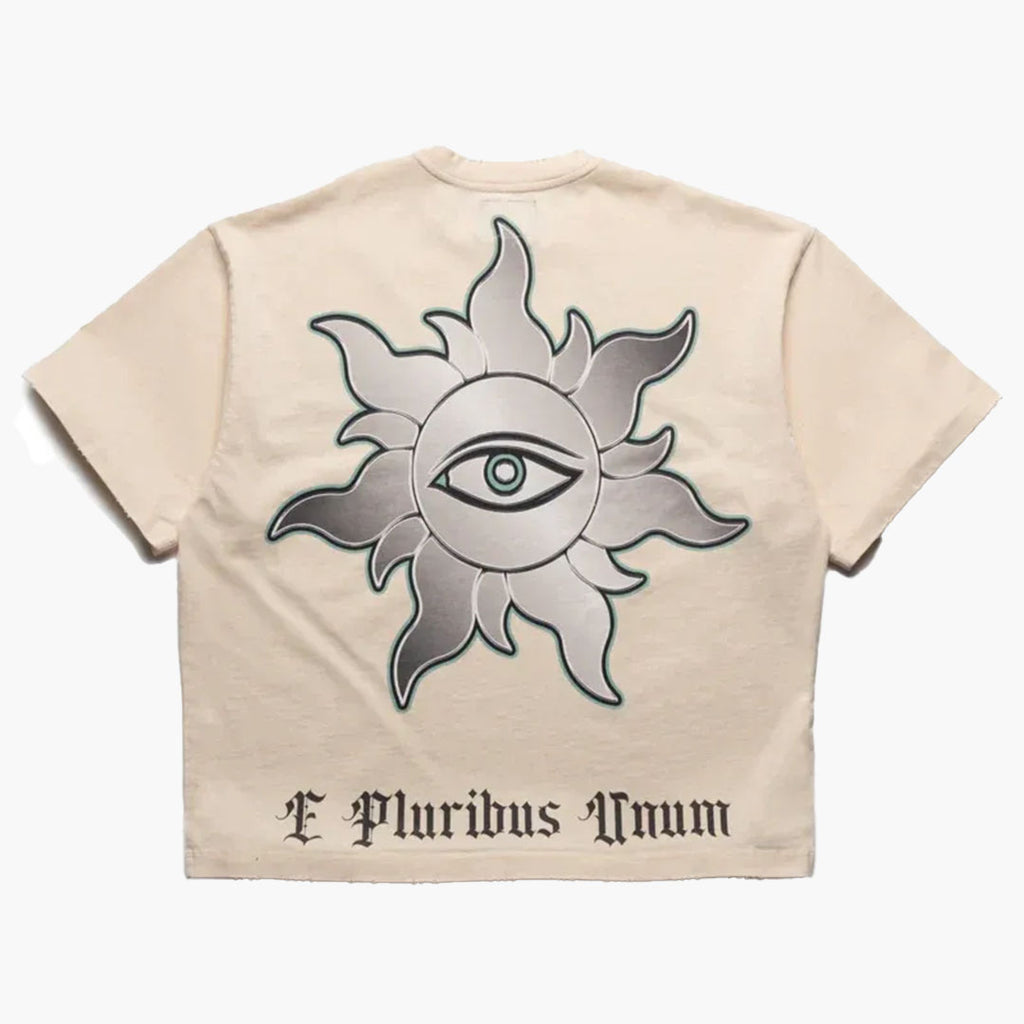 Das Godspeed Liberty Lift Tee Cream kombiniert ikonische Bildsprache mit markanter Streetwear-Ästhetik. Die cremefarbene Base sorgt für einen hochwertigen, sommerlichen Look und setzt den detailreichen Frontprint perfekt in Szene. Das Motiv zeigt die Freiheitsstatue vor einer modernen Skyline, während ein Helikopter darüber schwebt – ergänzt durch den markanten Godspeed Schriftzug im dunklen Gothic-Style. Die Kombination aus urbaner Kulisse und symbolträchtigem Design verleiht dem Shirt einen kraftvollen, statementstarken Charakter. Auf der Rückseite setzt das große Sun-Icon mit integriertem Eye-Detail ein prägnantes visuelles Highlight. Der „E Pluribus Unum“-Schriftzug am unteren Saum rundet das Design mit einem klassischen Branding-Element ab. Der lockere Fit und die hochwertige Baumwollqualität bieten optimalen Tragekomfort und machen das T-Shirt zum idealen Piece für moderne Streetwear-Outfits mit starkem Wiedererkennungswert.Bei HYPENEEDZ erhältst du ausschließlich neue und 100% originale Produkte.