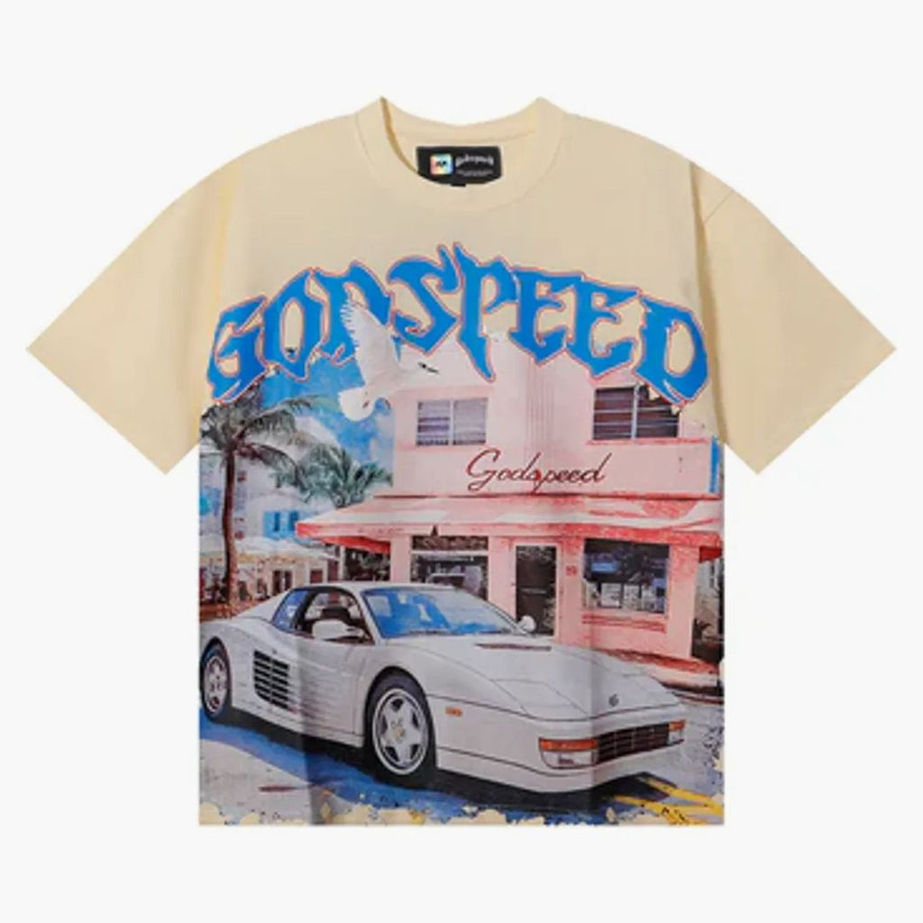 Das Godspeed Miami Vice Tee Cream verbindet ikonische Miami-Ästhetik mit luxuriösem Retro-Charakter. Die cremefarbene Base sorgt für einen sommerlichen, hochwertigen Look und bringt den detailreichen Frontprint perfekt zur Geltung. Das Motiv zeigt einen weißen Sportwagen vor pastellfarbener Art-Déco-Kulisse mit Palmen und Sonnenlicht. Der blaue Godspeed Schriftzug im markanten Gothic-Style setzt ein starkes Statement und unterstreicht den exklusiven Streetwear-Vibe. Auf der Rückseite sorgt das große „GS“-Logo in kräftigem Blau für einen cleanen, auffälligen Kontrast. Der „Manifested in MMXIII“-Schriftzug am unteren Rücken ergänzt das Design mit einem prägnanten Branding-Detail. Dank lockerem Fit und hochwertiger Baumwolle bietet das T-Shirt optimalen Tragekomfort und eignet sich perfekt für stilvolle Streetwear- und Sommer-Outfits mit Miami-Flair.Bei HYPENEEDZ erhältst du ausschließlich neue und 100% originale Produkte.