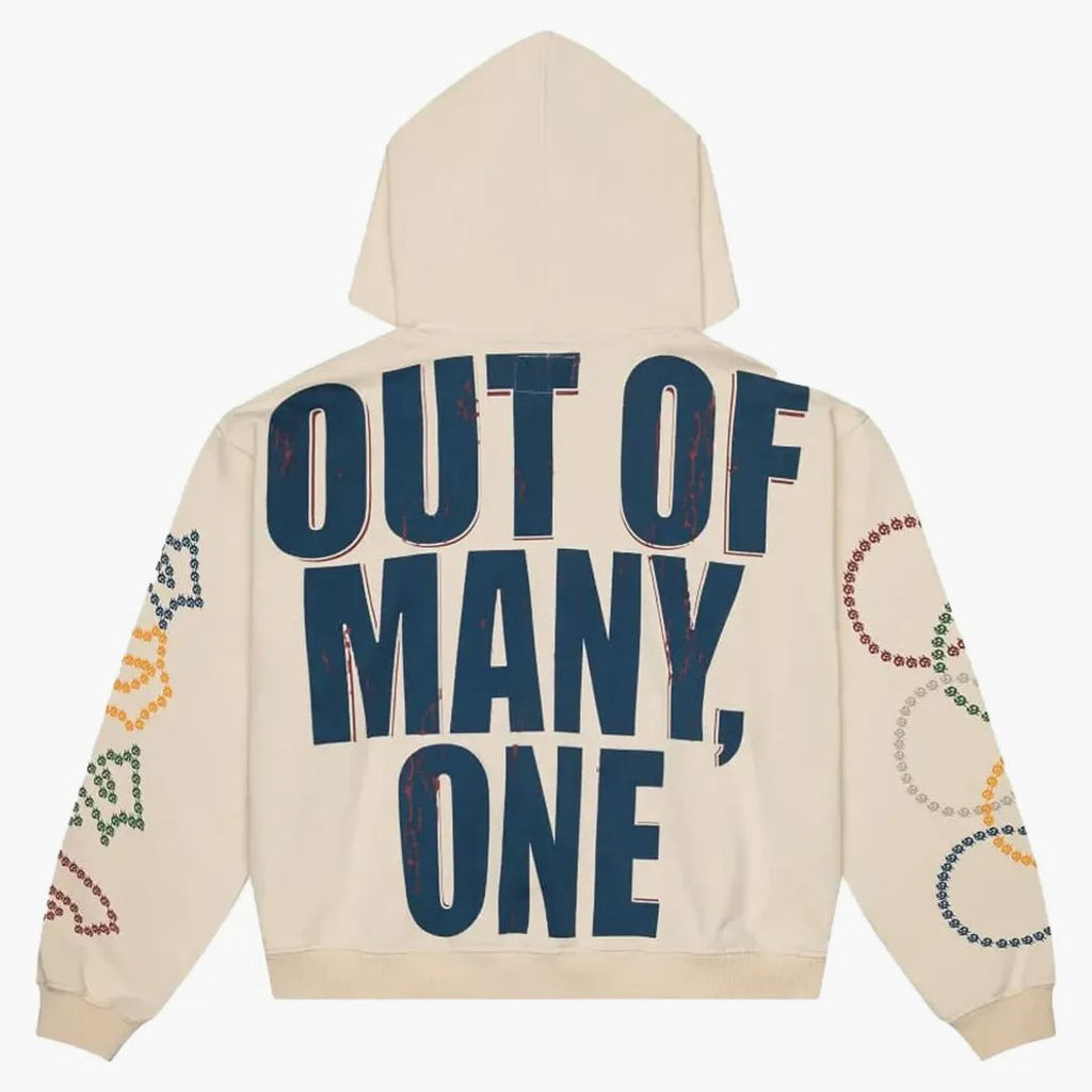 Der Godspeed Dream Team 2024 Hoodie Bone kombiniert Basketball-Vibes mit markanter Streetwear-Ästhetik. Auf der Vorderseite steht ein großflächiger Print im Fokus: Drei Skelett-Spieler im USA-Jersey mit Goldmedaillen und Basketball sorgen für einen auffälligen, sportlich-rebellischen Look. Der geschwungene „Godspeed“ Schriftzug im dunklen Gothic-Style rundet das Design ab und setzt einen starken Kontrast zum hellen Bone-Farbton. Die Ärmel sind mit mehrfarbigen Ketten-Details versehen und verleihen dem Hoodie zusätzliche Dynamik. Auf dem Rücken dominiert der ikonische „Out Of Many, One“ Print in kräftigem Dunkelblau mit leichtem Vintage-Finish. Hochwertiger Druck, bequemer Fit und auffällige Grafiken machen diesen Godspeed Hoodie zum perfekten Statement Piece für moderne Streetwear-Outfits mit Basketball- und Retro-Flair.Bei HYPENEEDZ erhältst du ausschließlich neue und 100% originale Produkte.