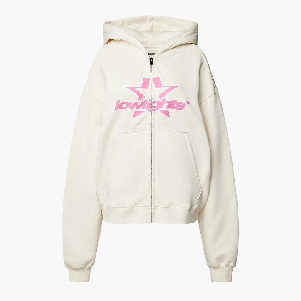 Der Lowlights Studios Superstar Zip Hoodie in Ecru bringt verspielte Y2K-Vibes mit femininer Energie. Der auffällige pinke Sternenprint mit Logo trifft auf kuscheligen Fleece-Stoff, Kängurutaschen und einen durchgehenden Reißverschluss. Perfekt für Cozy-Looks mit auffälligem Retro-Flair.