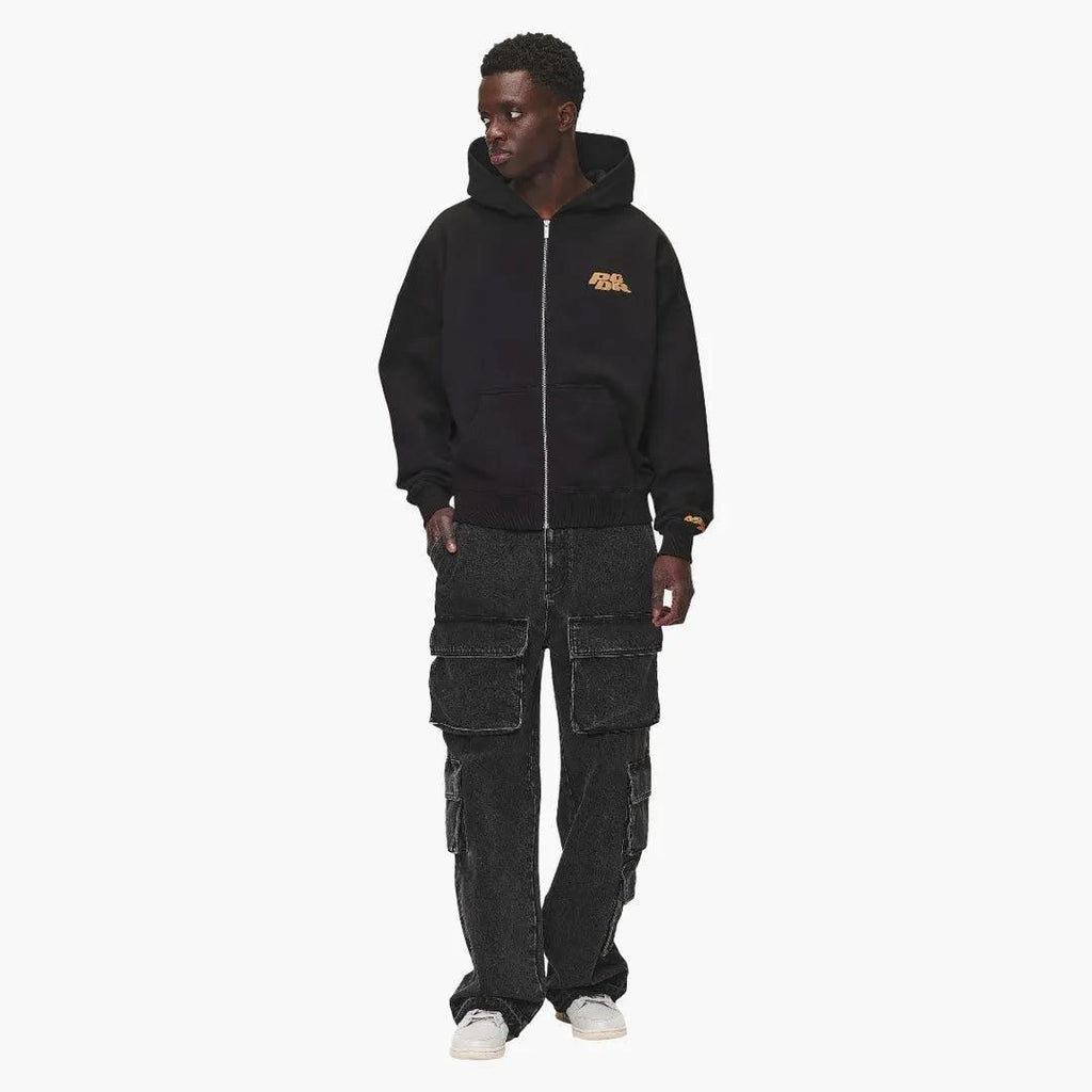 Boxy Fit Hoodie mit Front-Zipper und goldfarbenem Pegador-Schriftzug auf Brust und Ärmel. Die Kapuze mit Tunnelzug sowie die Rippbündchen sorgen für klassischen Tragekomfort. Die aufgesetzte Kängurutasche rundet den Look ab – perfekt für Layering und markante Streetwear-Styles.