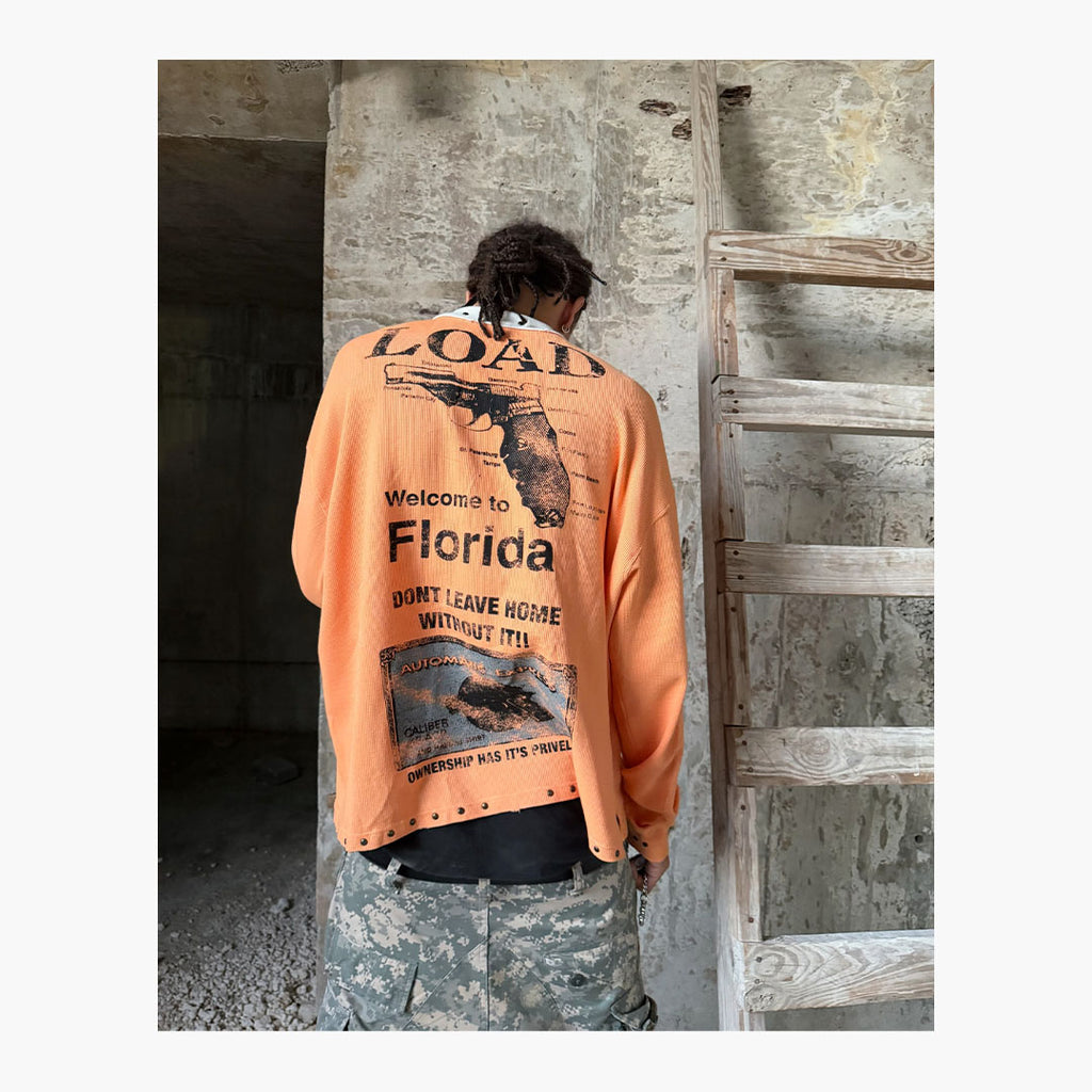 Das Triple Sevens Payback Polo in Orange kombiniert sportliche Silhouette mit provokanter Statement-Grafik und markanten Details. Die kräftige Orange-Nuance trifft auf eine strukturierte Waffel-Textur, die dem Polo Tiefe und eine hochwertige Haptik verleiht. Der kontrastierende graue Kragen mit Metallnieten sorgt für einen edgy Akzent und hebt das Design klar vom klassischen Polo-Look ab. Auf der Vorderseite setzen das „77“-Detail, der „Payback“-Schriftzug sowie das markante Emblem ein starkes, selbstbewusstes Statement. Die Rückseite greift das Thema mit großflächigem „Load – Welcome to Florida“-Print im Used-Style auf und unterstreicht die rebellische Attitude des Pieces. Nieten-Details am Saum und an den Ärmeln runden das Design konsequent ab. Der leicht boxy Fit sorgt für eine moderne Passform zwischen Streetwear und Statement-Resort-Style. Ein auffälliges Key-Piece für alle, die Farbe, Charakter und kompromisslose Ästhetik kombinieren wollen.Bei HYPENEEDZ erhältst du ausschließlich neue und 100% originale Produkte.