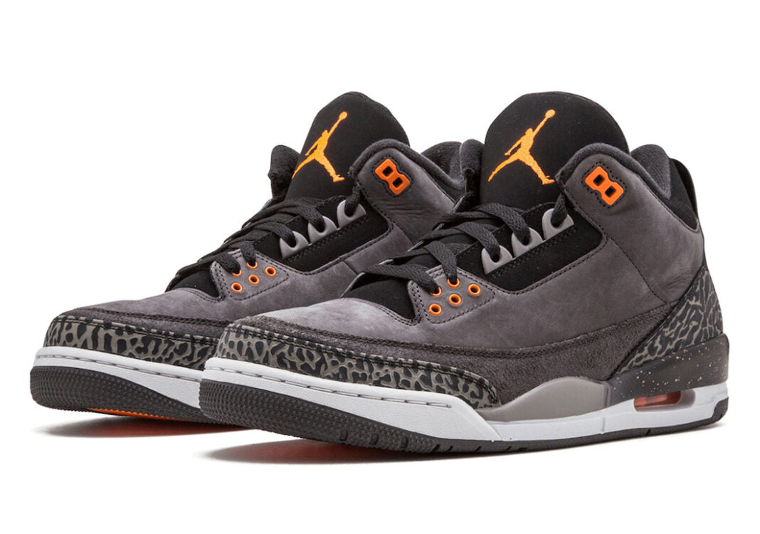 The Air Jordan 3 Fear Consists of a beautiful wild leather in gray color, paired with the elephant pattern, that a great colorway. Black details next to the laces are upgraded with gray lace containers. Orange details on the tongue and on the heel control the necessary colors. The peculiarity of the Air Jordan 3 Fear is the Red Air Bubblethat makes the sneaker extremely comfortable. The midsole at the level of the bubble was sprinkled in black and white, looks like the night sky. Furthermore, the sole is still made of gray in the middle part and knows with black details in the lower one.