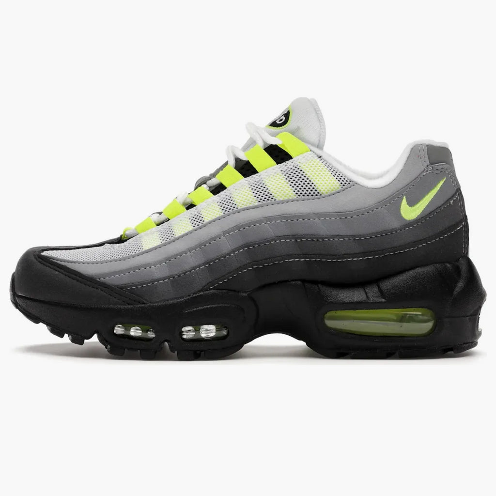 With the Nike Air Max 95 OG Neon (2020) (GS), young sneaker fans experience a classic in new splendor. Inspired by the forms of the human body, this shoe presents itself in a striking mix of black, neon yellow and gray tones. While the upper material shows gray gradations, neon -colored details set dynamic accents on the eyelets, heel, heel and the iconic Swoosh. The visible Max Air elements in forefoot and heel ensure first-class damping, while the waffle rubber outsole stands for optimal hold. Reflective elements on the tongue and heel offer additional visibility. Discover the Air Max 95 OG Neon-a must for young trendsetters and sneaker enthusiasts.All at Hypeneedz offered items are guaranteed New and authentic. Every article is from our Team of experts Checked exactly before it is sent to you.