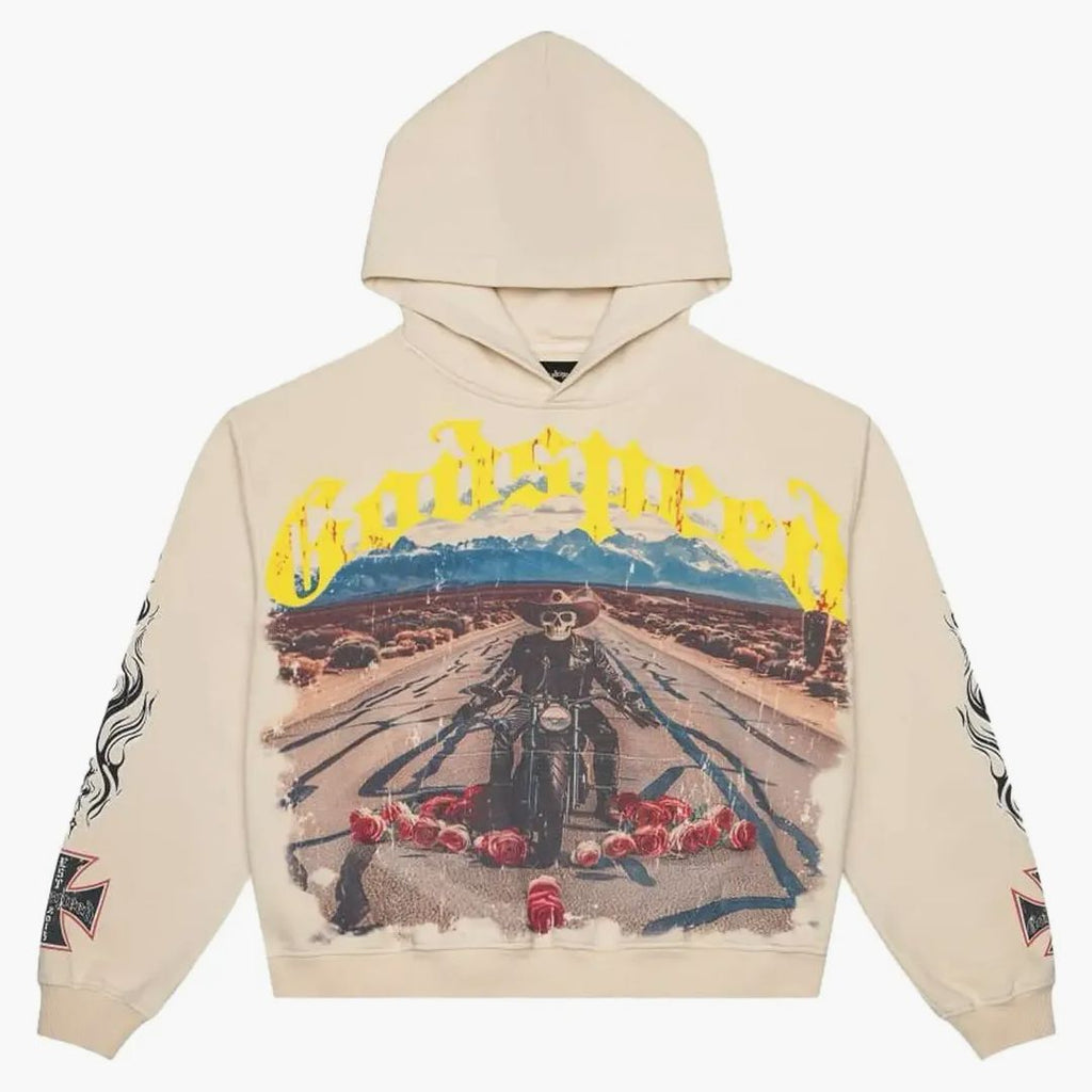 Der Godspeed Long Lonely Road Hoodie Bone verbindet rebellischen Biker-Vibe mit markanter Streetwear-Ästhetik. Auf der Vorderseite dominiert ein großflächiger Print mit Skelett-Biker auf einer endlosen Wüstenstraße, umgeben von Bergen und roten Rosen. Der leuchtend gelbe „Godspeed“ Schriftzug im Gothic-Style setzt einen starken Kontrast zum hellen Bone-Farbton und verleiht dem Hoodie maximale Präsenz. Schwarze Flammen-Details und Cross-Elemente auf den Ärmeln unterstreichen den rockigen Look. Auf dem Rücken sorgt der ikonische „Out Of Many, One“ Print in kräftigem Gelb mit leichtem Vintage-Finish für ein klares Statement. Hochwertiger Druck, bequemer Fit und auffällige Grafiken machen diesen Godspeed Hoodie zum perfekten Piece für ausdrucksstarke Streetwear-Outfits mit Western- und Biker-Flair.Bei HYPENEEDZ erhältst du ausschließlich neue und 100% originale Produkte.