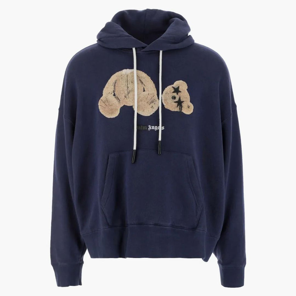 Palm Angels Bear Print Sprayed Logo Hoodie Navy Blue/brown