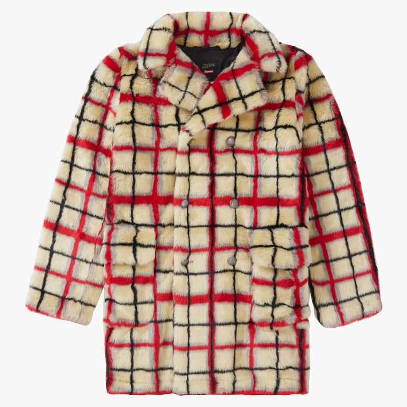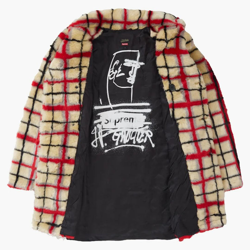 Supreme Jean Paul Gaultier Double Breasted Plaid Faux Fur Coat Offwhite