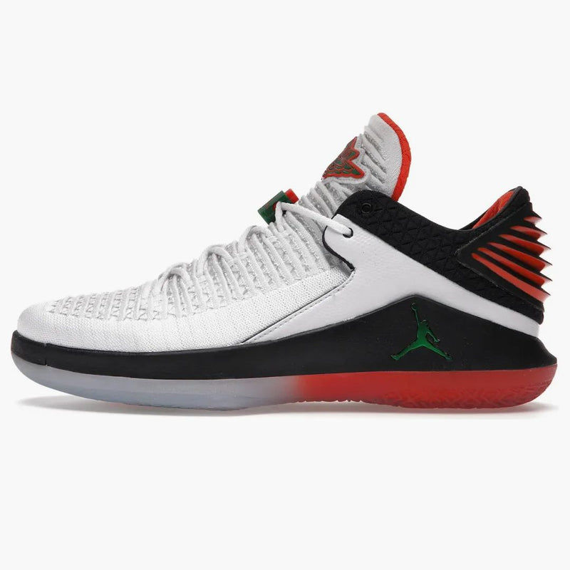 Ze swoim projektem, zainspirowanym kultowym kampanią „Like Mike” z 1991 roku, Jordan XXXII łączy Low Podobnie jak Mike Gatorade Nostalgiczne szczegóły o nowoczesnym stylu. Funkcje specjalne, takie jak zamknięcie butelki Gatorade jako sznurowadła i uderzające logo Flash na wkładce, stanowią hołd legendarnej kampanii reklamowej. Kolory Gatorade, takie jak Rush Orange i Pine Green, przeciągają projekt buta, który ma lekki górny materiał Flyknit.