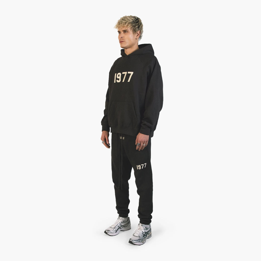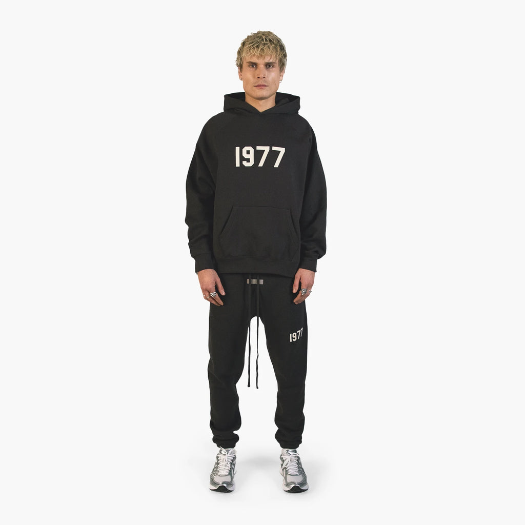 Zeitloser Streetwear-Klassiker in edlem Schwarz – das Fear Of God Essentials 1977 Set vereint minimalistisches Design mit hochwertiger Verarbeitung. Der Oversized Fit sorgt für einen lässigen Look, während das tonale 1977-Reliefprint auf Brust und Hosenbein dem Set seinen ikonischen Charakter verleiht. Weiches Fleece-Innenmaterial garantiert maximalen Komfort. Elastische Bündchen und ein breiter Taillenbund mit Kordelzug runden den modernen Athleisure-Style perfekt ab – ideal für Alltag, Lounge oder Layering.