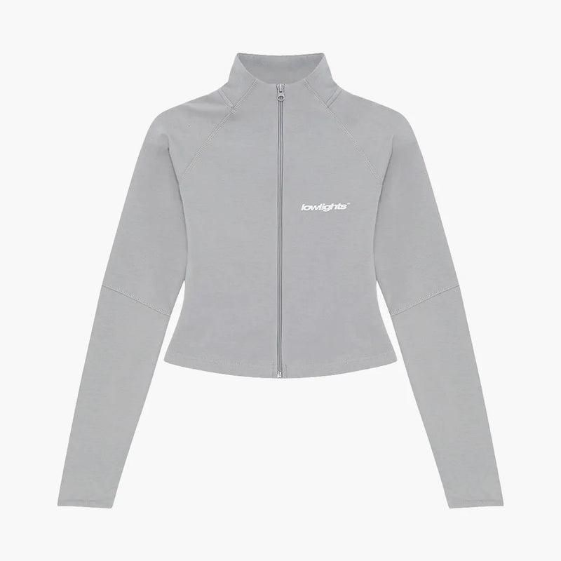 Figurnah geschnittenes Zip Top in Light Grey mit Stehkragen und durchgehendem Reißverschluss. Das elastische Material schmiegt sich angenehm an den Körper, während der dezente „lowlights®“-Print auf der Brust den minimalistischen Look unterstreicht. Ideal für athletisch-inspirierte Outfits oder cleane Layering-Styles.