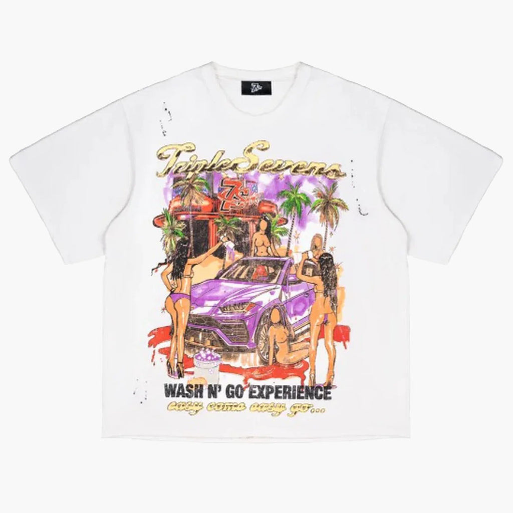 Das Triple Sevens Wash & Go T-Shirt in Cream bringt provokanten Miami-Lifestyle und auffällige Street-Art-Ästhetik zusammen. Die Vorderseite zeigt eine detailreiche Szene rund um ein violettes Car im Wash-&-Go-Setting, umgeben von Palmen, kräftigen Farben und markanten Charakter-Illustrationen. Der goldene „Triple Sevens“-Schriftzug setzt einen luxuriösen Akzent, während der „Wash N’ Go Experience“-Print dem Design eine rebellische, plakative Note verleiht. Auf der Rückseite steht das „Time to Shine!“ Artwork im Fokus. Mehrteilige Illustrationen, Bubble-Elemente und auffällige Farbkontraste greifen das Thema Glanz, Lifestyle und Attitude auf. Die Kombination aus Gold-, Lila- und Rottönen sorgt für maximale visuelle Präsenz. Der cremige Grundton balanciert die intensiven Grafiken aus und macht das Shirt vielseitig kombinierbar. Mit seinem lockeren, leicht oversized Fit ist es ein echtes Statement-Piece für auffällige Sommer-Looks mit kompromissloser Streetwear-Energie.Bei HYPENEEDZ erhältst du ausschließlich neue und 100% originale Produkte.