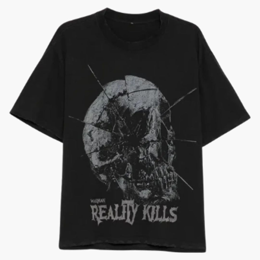 Das schwarze Graphic T-Shirt überzeugt mit einem markanten Broken-Skull-Design im düsteren Vintage-Look. Der großflächige Totenkopf-Print mit rissiger, zersplitterter Optik sorgt für eine rohe, rebellische Ästhetik und starke Kontraste in Grau auf tiefschwarzem Grund. Der „Reality Kills“-Schriftzug unterstreicht den provokanten Charakter des Designs und verleiht dem Shirt zusätzlichen Statement-Faktor. Der lockere Schnitt und das angenehme Material bieten hohen Tragekomfort und machen das Shirt zum idealen Piece für auffällige Streetwear-Fits. Perfekt für alle, die auf schwarzes Skull T-Shirt, Gothic-Vibes und ausdrucksstarken Urban Style setzen.