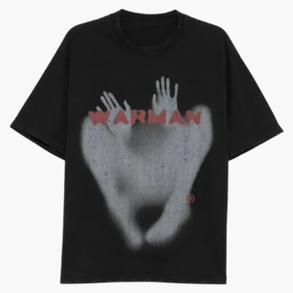 Das schwarze Graphic T-Shirt überzeugt mit einem provokanten und künstlerischen Design im Airbrush-Style. Das zentrale Motiv zeigt eine schemenhafte Figur mit erhobenen Händen in verschwommener Optik, wodurch ein geheimnisvoller, fast surrealer Effekt entsteht. Der rote „Warman“-Schriftzug setzt einen markanten Kontrast und unterstreicht den rebellischen Charakter des Prints. Die reduzierte Farbgebung in Grau, Schwarz und Rot verstärkt die düstere Ästhetik und verleiht dem Shirt einen modernen Streetwear-Vibe. Der lockere Schnitt und das angenehme Material sorgen für hohen Tragekomfort im Alltag. Ideal für alle, die auf schwarzes Graphic T-Shirt, provokante Prints und individuellen Urban Style setzen.Bei HYPENEEDZ erhältst du ausschließlich neue und 100% originale Produkte.